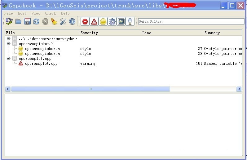 设置完后就可以用cppcheck检查指定目录下的代码文件:tools=>external=>cppcheck