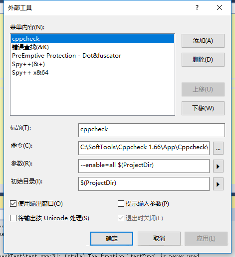 ¹´Ñ¡Í˳öʱ¹Ø±ÕºÍʹÓÃÊä³ö´°¿Úºóµã»÷È·¶¨£¬¾Í¿ÉÒÔ½«cppcheck¹¤¾ßÌí¼Óµ½vsÖС£