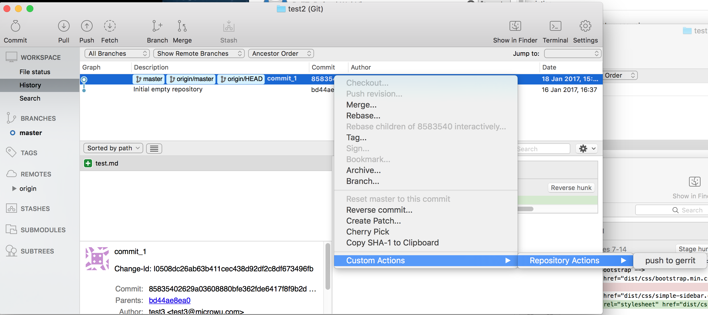 最后当我们要通过推送到gerrit服务器时,在当前的分支上,右键,然后点击Custom Actions,再选择我们刚创建的push
