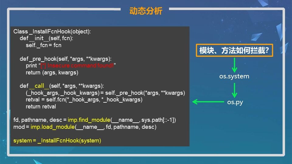 首先通过imp导入os模块,然后在覆盖到其中的system方法
