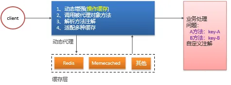 相比传统的写法,为了解决缓存各种数据格式(List、Map等),各种对象序列化问题(java、json),团队内可以针对缓存这块,封装成简单的API,方便大家使用。使用简单了,但代码依然嵌入在业务代码中,没有剥离出来。