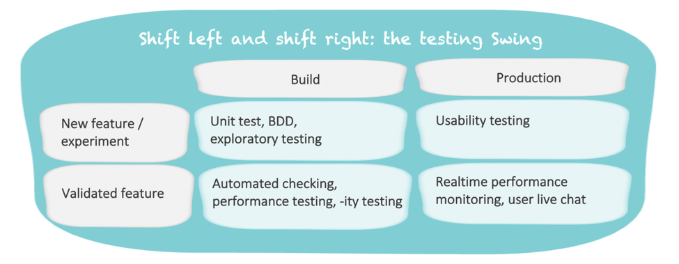 the testing Swing》,提出了一个有意思的测试矩阵,从四个维度进行分析,描述了当软件开发模式从瀑布到敏捷、再到DevOps转型时,测试该如何响应变化。