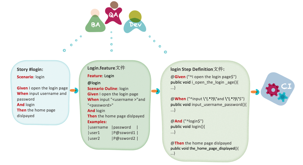 BA用BDD方式定义用户需求,QA Review并补充AC,然后将其编写为自动化测试脚本。如果QA的编码能力较弱,可以让Dev协助完成代码实现的部分。这也充分说明了协作的意义。