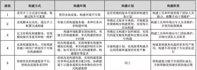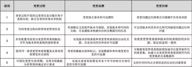 从五个方面对它进行成熟度的分级。最高级,比如在版本控制系统方面,要有版本的控制系统,产品开发的版本控制系统。它是有生命周期的,所有的版本,包括修改等等流程都可以进行管理。比如分支的管理,就是持续优化分支管理策略,等等。