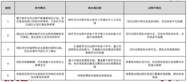 这三个工作从人员机制到工具能力,会用到不同程度的工具,以及人员协作的流畅度,协作的程度是不一样的。所以把它分成五级,大家可以看一下上图右边的内容。