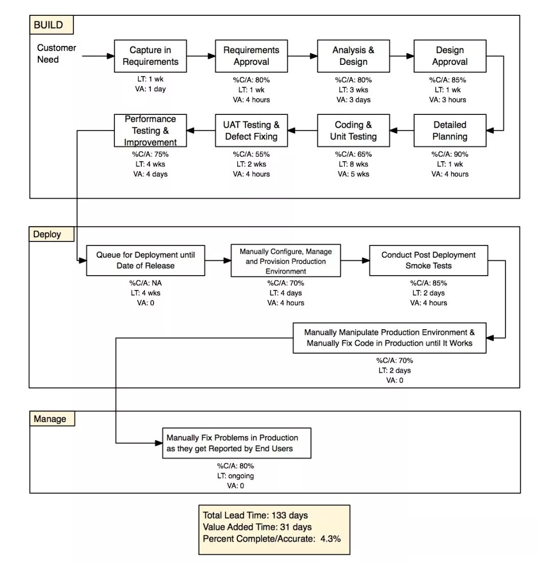如果DevOps转型的项目是棕地项目,要对工作的价值流进行细致的研讨和分析,画出当前的状态。如下图的示例所示(注:这是一个示例,你的棕地项目分析完之后并非如此)。