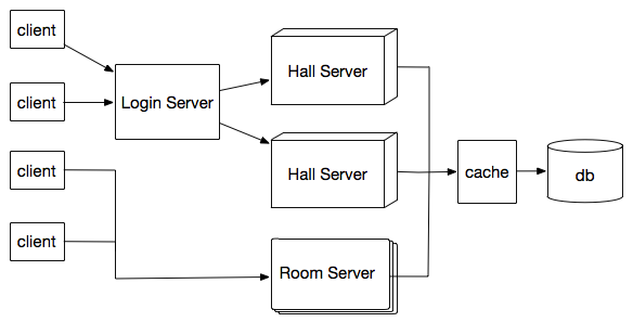 在大厅服务器中,所有在线的玩家,都按其ID来分布在多个进程中的一个,在玩家之间的查询、广播操作时,采用多个服务器并行操作,最后汇总结果的方式来提供。这样的操作延迟是会比较高,但是能让海量的用户数据存储到不同的机器上;而房间服务器则只负责提供具体的游戏广播功能,一旦玩家组成了群组进入,大厅服务器会拷贝数据到房间服务器,而房间服务器就只对这几个玩家负责了,游戏结束则清理掉这些玩家数据,准备新的游戏。