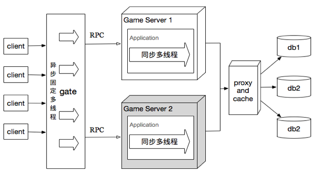 SOA架构模式是一个经典的分布式软件架构模式,服务之间使用RPC运程调用功能,而服务的注册和发现则使用ZooKeeper这样的目录服务器。这样游戏服务就拆分为三层结构:最前边的网关(gate)服务器、中间为各游戏服务器(gameServer),最后边的数据库(DB)服务器。这样把网络功能单独提取出来,让用户统一去连接一个网关服务器,再由网关服务器转发数据到后端游戏服务器。而游戏服务器之间数据交换也统一连接到网关服进行交换。所有与DB交互的都连接到DB服务器来代理处理。