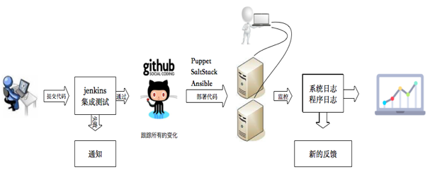通过技术工具,把传统的手工操作转变为自动化流程,这不仅有利于提高产品开发、运维部署的效率,还将减少人为因素引起的失误和事故,提早发现问题并及时地解决问题,这样也保证了产品的质量。下图展示了DevOps自动化的流程: