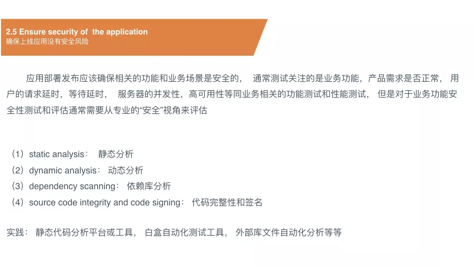 比如静态分析,所有应用涉及的代码都应该能够通过静态代码分析,确保是安全的没有问题的才能上线,包括所有的代码,前端代码、后端代码。另外动态代码分析,代码能够在虚拟机也好或者是真实的运行环境也好,能够实际运行,把里面产生的安全风险也能提前暴露出来。