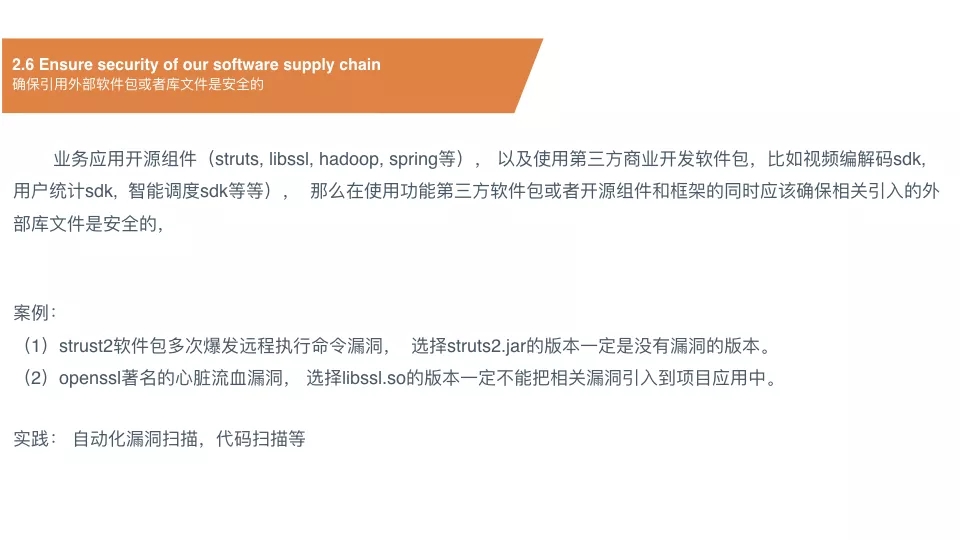 下面举这个例子就是来说明这个事的,像OpenSSL、struts 2、Hadoop、Spring等,包括第三方商业开发软件包,比如视频编解码SDK、用户统计SDK或者智能调度SDK,都是花钱去买的,也要确保这个买过来的SDK是一个安全可靠的。这里面提到实践,在你组织要想做到既不影响整个项目的开发周期和交付效率,又能够达到安全的目标,基本上要实现自动化检查、自动化分析和自动化扫描,在整个组织中才能实现既安全又快速的目标。