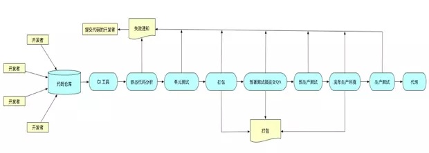 通过技术工具,把传统的手工操作转变为自动化流程,这不仅有利于提高产品开发、运维部署的效率,还将减少人为因素引起的失误和事故,提早发现问题并及时地解决问题,这样也保证了产品的质量。下图展示了DevOps自动化的流程: