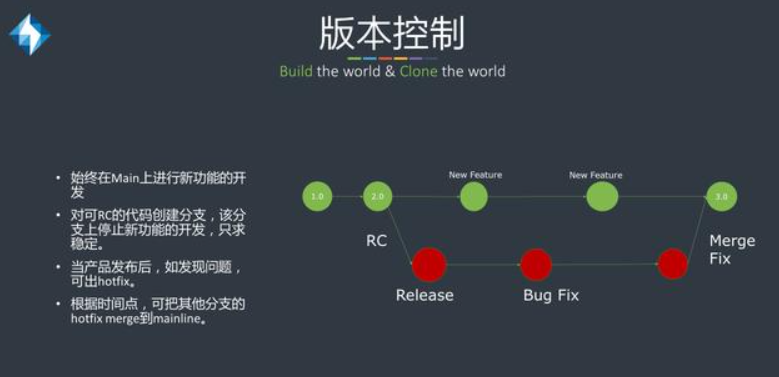 DevOps下版本控制的原则是始终在Mainline上进行新功能的开发,并经由持续集成的自动化测试对代码进行验证。当功能开发到一定阶段的时候,对可RC的代码创建分支,该分支上停止新功能的开发,只求稳定。当产品发布后,如发现问题,可出hotfix。根据时间点和具体需要,可把其他分支的hotfix