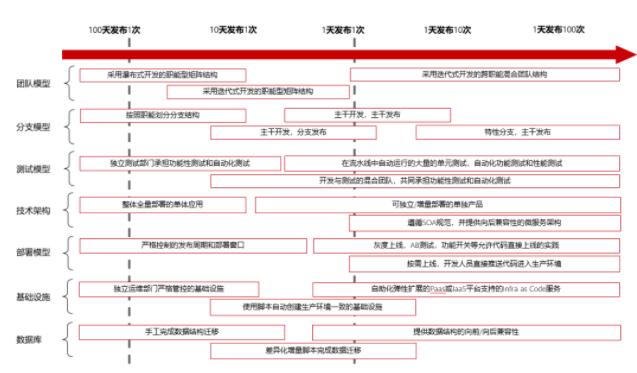 上图是以发布频度为抓手,从100天发布一次,逐步的十倍速增长,到10天发布一次,在两个阶段点,从七个维度来看,需要匹配与采纳的实践是什么。