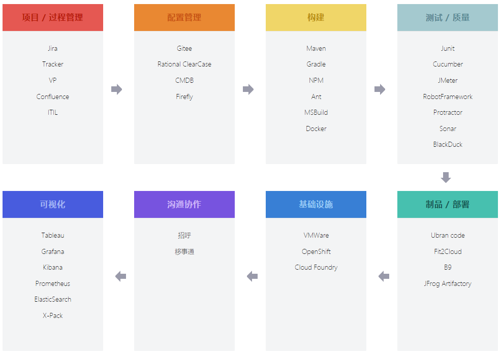对于信通院发布的DevOps能力成熟度模型还是可以作为一个重要的参考标准。该系列标准分为敏捷开发管理、持续交付、技术运营、应用设计、安全风险管理、组织结构及系统和工具等部分,涵盖了软件开发到运维的全生命周期,如下图: