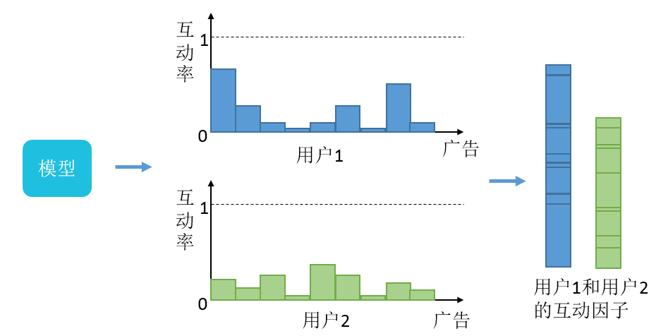 互动因子表示当前用户倾向于广告互动的程度,越大越可能产生互动。假如历史上所有用户看到的广告都是一样的,那么可以通过简单的统计对其估算,但难点就在于大部分用户历史投放的广告是不一样的,而且还有部分用户之前从未看过广告。