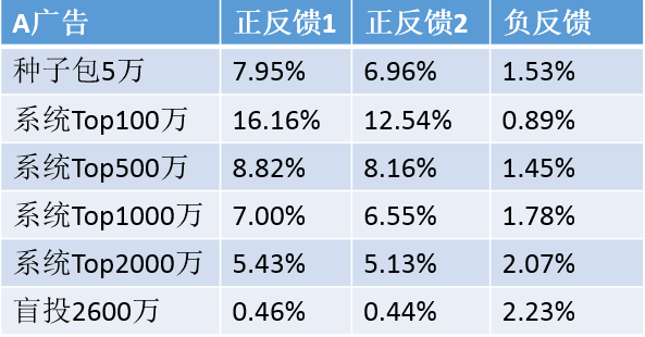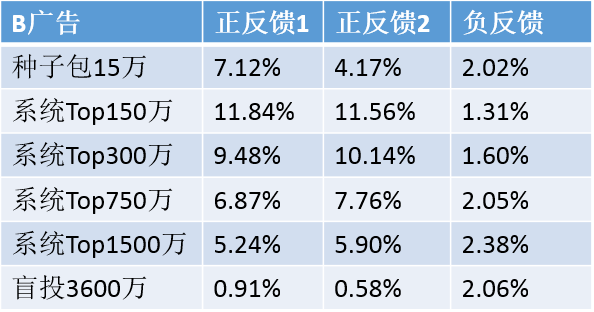 该系统已在微信朋友圈广告上使用,下表是对A,B两个广告的投放效果(这里列出正反馈1,正反馈2,和