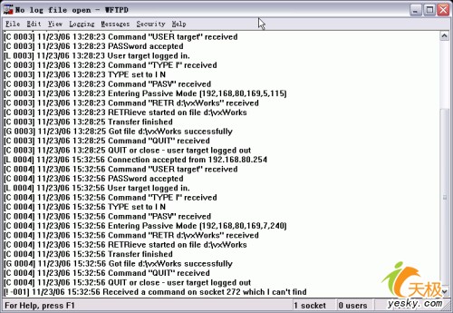 为了便于观察引导程序是否从FTP上下载了VxWorks映像,最好打开FTP Server的日志功能。选择“Logging”菜单下的“Logging