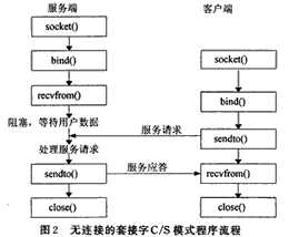 五连接的服务一般都是面向事务处理的,一个请求一个应答就完成了客户端与服务端之间的信息交互。无连接的套接字C/S模式程序的流程如图2所示。