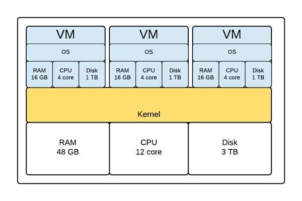 但是,应该注意到一个缺点。主机分配给每个虚拟机的所有资源都是专用的。无论这台虚拟机是什么,都会被分配到16GB内存。但是,如果第一台虚拟机从未使用超过1 GB的内存分配,其余15GB就会闲置在那里。如果第三台虚拟机只使用它分配到的1TB存储空间中的100GB,那么剩余的900GB都是浪费掉的的存储空间。