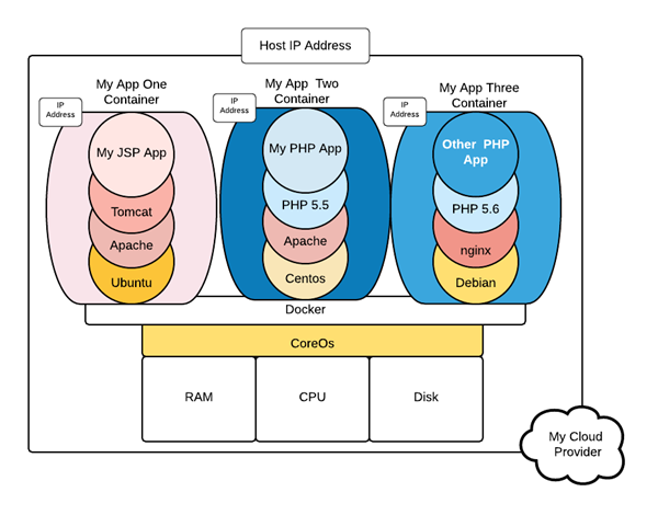 在此之前,所有容器的多功能性是由一款叫做容器管理器的软件控制的。目前,最流行的容器管理软件是Docker和Rocket。上图描述的就是这样一个主机,该主机利用Docker来管理容器并且使用CoreOS操作系统。