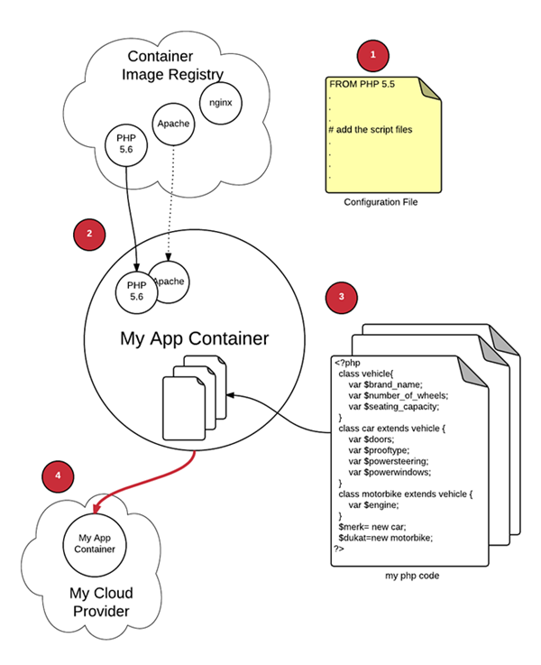 从概念上来说,对于那些熟悉Java的人来说,注册表类似于Maven库,或者类似于你.NET平台下的一个NuGet服务器。创建一个容器配置文件,以便于列出应用程序所需的全部镜像。利用容器管理器来生成一个容器,这个容器可以包括应用程序源码以及从容器注册表下载的组成资源。例如,如果你的应用程序是由PHP文件组成的,容器配置文件将允许你从注册表获取PHP运行环境。同样,也可以使用容器配置文件来申明复制到容器文件系统所需的.php文件。容器管理器可以将应用程序里的组件封装成一个不同的容器,在有容器管理器的情况下,你可以在主机上运行此容器。