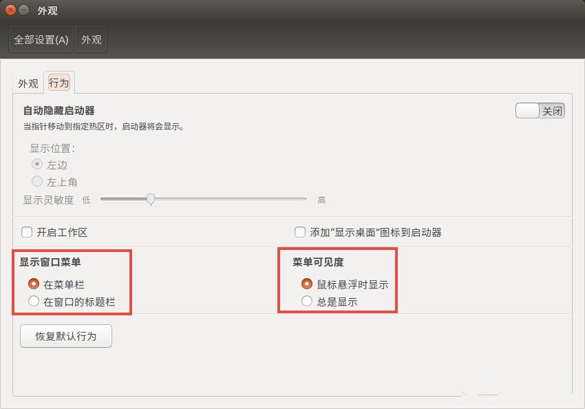 在「系统设置」-「外观」-「行为」选项卡中控制菜单在菜单栏或窗口中进行显示,也可以从「菜单可见」度选项中控制菜单总是显示或自动隐藏。