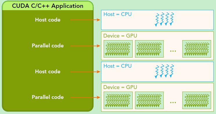 GPU并不是一个独立运行的计算平台,而需要与CPU协同工作,可以看成是CPU的协处理器,因此当我们在说GPU并行计算时,其实是指的基于CPU+GPU的异构计算架构。在异构计算架构中,GPU与CPU通过PCIe总线连接在一起来协同工作,CPU所在位置称为为主机端(host),而GPU所在位置称为设备端(device),如下图所示。