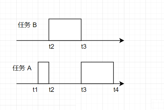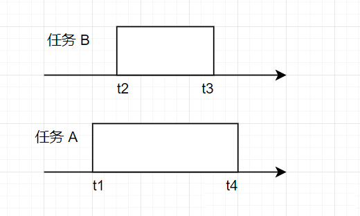 任务 A 在时刻 t1 到 t4 之间完成,任务 B 在时刻 t2 到 t3 之间完成,它们的运行时间段有重叠部分,这种运行方式称为“并发”运行。在多