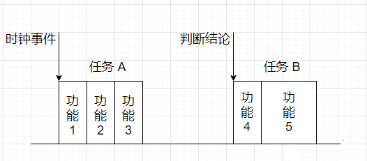如果若干功能由相同的事件触发,则可以将这些功能组合成为一个任务,从而免除将事件分发给多个任务的工作量。但是这也必须有一个条件,就是当以某种次序顺序执行这些功能的时候,各个功能的实时性要求仍然可以得到满足,这是关键。同时,这里说的触发条件相同的任务,通常外部触发的任务一般是关键任务或者紧迫任务,需要按照前文所述的方法来进行任务的划分,符合本类任务的触发条件通常是内部事件,比如说一个时钟事件,也就是说到了指定时间就触发这个任务,或者说是某个任务运行之后得到一个结论,这结论又触发了一个任务。如下图示意图所示: