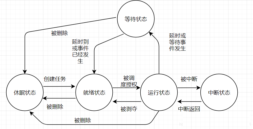 任务的状态是动态变换的,这意味着这些任务并不是随时都可以运行的,任务具有以下五种不同的状态下图用状态图的形式表示出来。