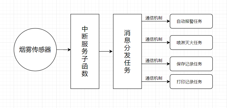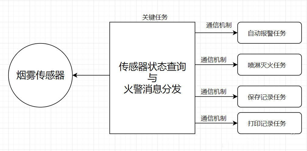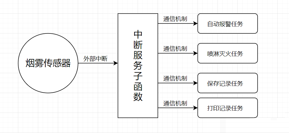 除了将关键任务和其他功能的任务相剥离,并设置最高优先级以外,还有一种方法能够使得关键任务得到准确执行,那就是采用中断的方式,比如说,在火警的报警系统中,让传感器的火警信号触发一个外部中断,中断发生便完成了信号检测功能,再由中断服务函数使用某种通信机制通知其他任务。下面是示意图: