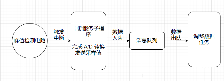 下图是一个数据采集任务,数据采集时一个紧迫任务,通过峰值检测电路触发中断,在中断里完成 A/D 转换,下图是整个数据采集系统的示意图:
