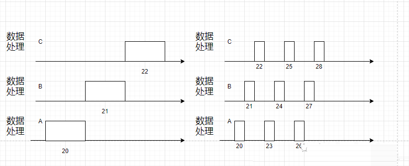用户应用程序中消耗时间最多的就是各种数据处理单元,这种单元通常不止一个,他们通常为不同的功能服务。应该将这些单元划分出来,分别包装成不同的任务。由于这类任务需要消耗较多的时间,那么他们的优先级必须安排的比较低,除此之外的方法,如果操作系统支持将多个任务安排相同优先级的机制,那么当有多个数据处理任务时,可安排相同的优先级,采用时间片轮转的方式运行,如果操作系统不支持多个任务具有相同的优先级,那么可以将多个需要并行的数据处理任务分成多个数据处理任务,原理如下图所示: