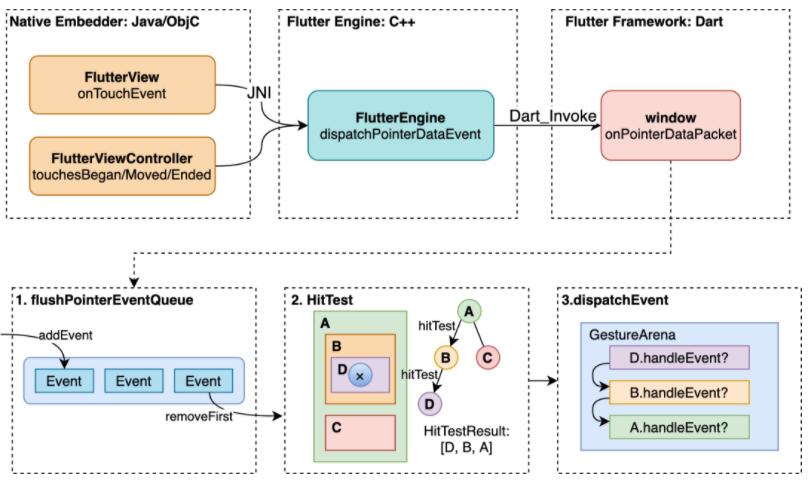 Flutter 框架层,并完成事件的消费、分发和逻辑处理。同样,整个流程的大部分工作已经由 Flutter