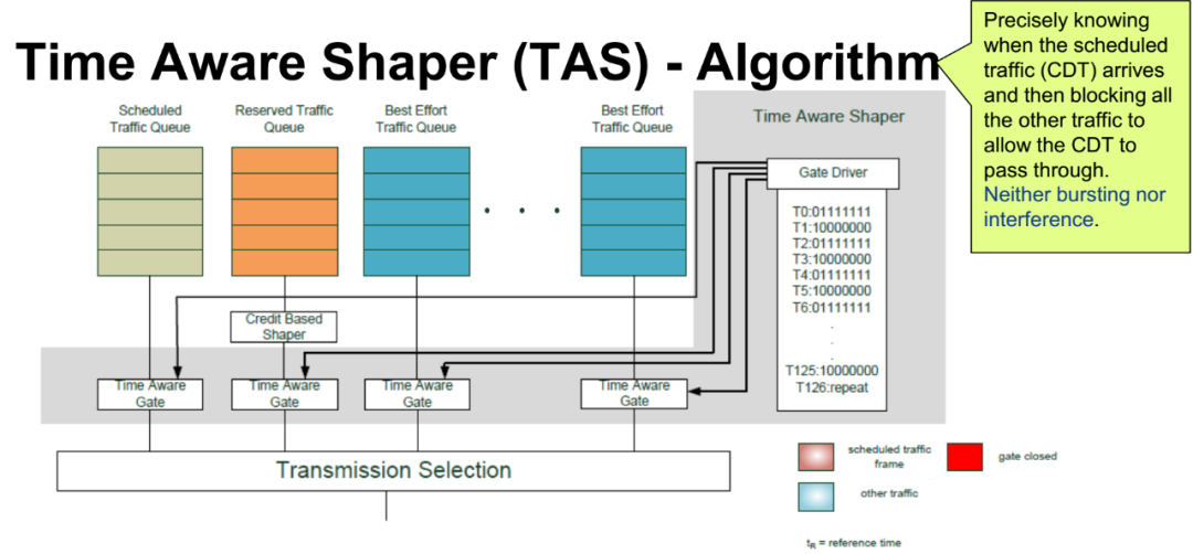 通过时间感知整形器(Time Aware Shaper)使TSN交换机能够来控制队列流量(queued traffic),以太网帧被标识并指派给基于优先级的VLAN Tag,每个队列在一个时间表中定义,然后这些数据队列报文的在预定时间窗口在出口执行传输。其它队列将被锁定在规定时间窗口里。因此消除了周期性数据被非周期性数据所影响的结果。这意味着每个交换机的延迟是确定的,可知的。而在TSN网络的数据报文延时被得到保障。TAS介绍了一个传输门概念,这个门有“开”、“关”两个状态。传输的选择过程-仅选择那些数据队列的门是“开”状态的信息。而这些门的状态由网络时间进度表network schedule进行定义。对没有进入network schedule的队列流量关闭,这样就能保障那些对传输时间要求严格的队列的带宽和延迟时间。TAS保障时间要求严苛的队列免受其它网络信息的干扰,它未必带来最佳的带宽使用和最小通信延迟。当优先级非常高时,抢占机制可以被使用。