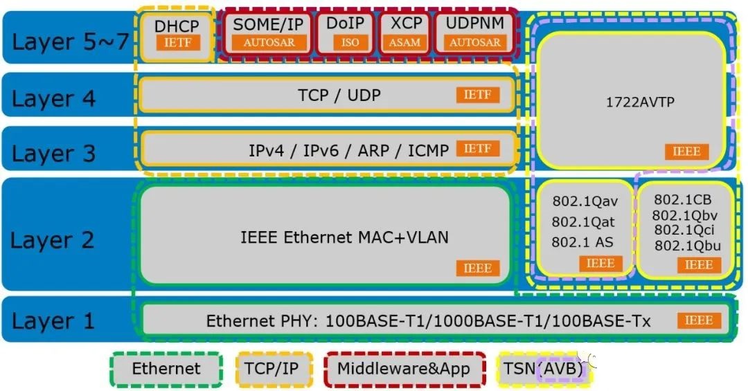 车载以太网标准分两部分,一部分是最底层的PHY标准,另一部分是链路层标准。这两个标准都以IEEE的标准应用最广泛。