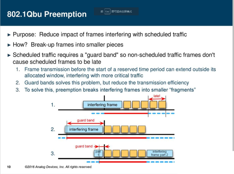 对于特别重要的数据,TSN规定了一个抢占机制,它由802.1Qbu/802.3br共同构成。对于IEEE802.1Qbu的抢占而言,正在进行的传输可以被中断,报文按等级可被分为可被抢占和抢占帧,抢占生成框架,最小以太网帧受到保护的,127字节的数据帧(或剩余帧)不能被抢占。IEEE802.1br定义了,设计了快速帧的MAC数据通道,可以抢占Preemptable MAC的数据传输。IEEE802.3br也同样可以与IEEE802.1Qbv配合进行增强型的数据转发。
