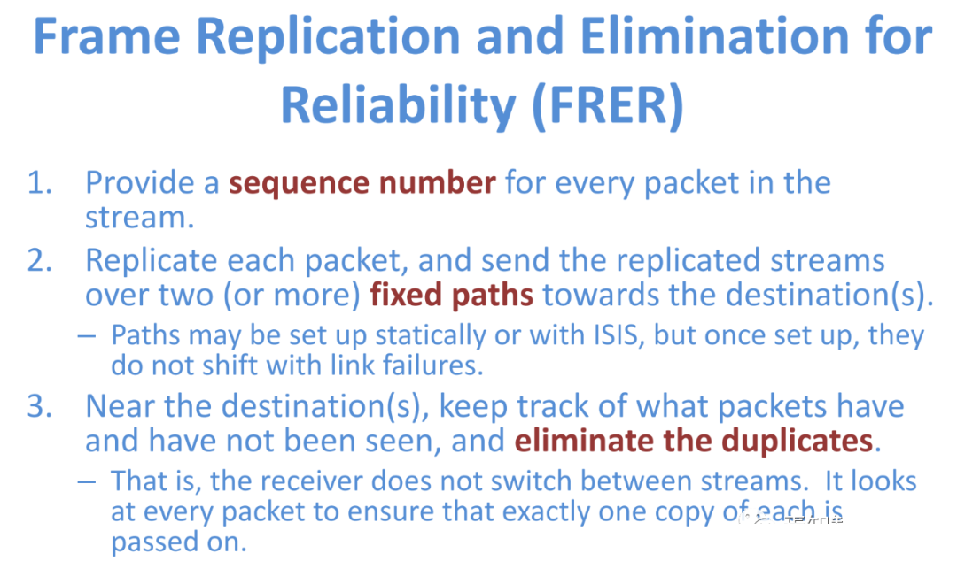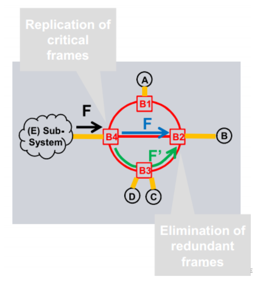 对于非常重要的数据,802.1CB会多发送一个数据备份,这个备份会沿着最远离主数据路径交集的路径传输。如果两个数据都接收到,在接收端把冗余帧消除,如果只接受到一帧数据,那么就进入后备模式。在ISO/IEC 62439-3中已经定义了PRP和HSR两种冗余,这种属于全局冗余,成本较高,802.1CB只针对关键帧做冗余,降低了成本。802.1CB标准的制定主要依靠思科和博通。