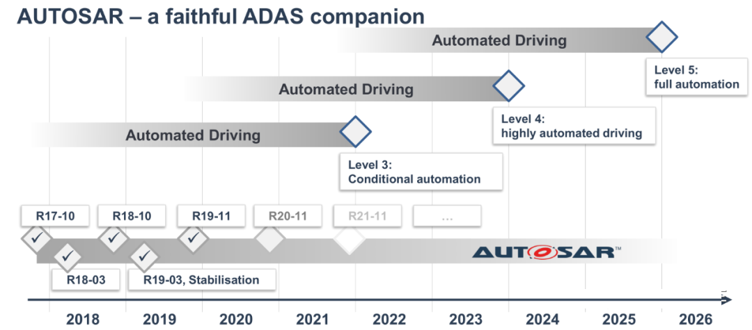 自适应Autosar是针对自动驾驶的,2021年11月版计划对应L3级自动驾驶,不过这个L3级换到中国或者马斯克口中,估计是L5了,目前一般推荐19-03版,比较稳定。