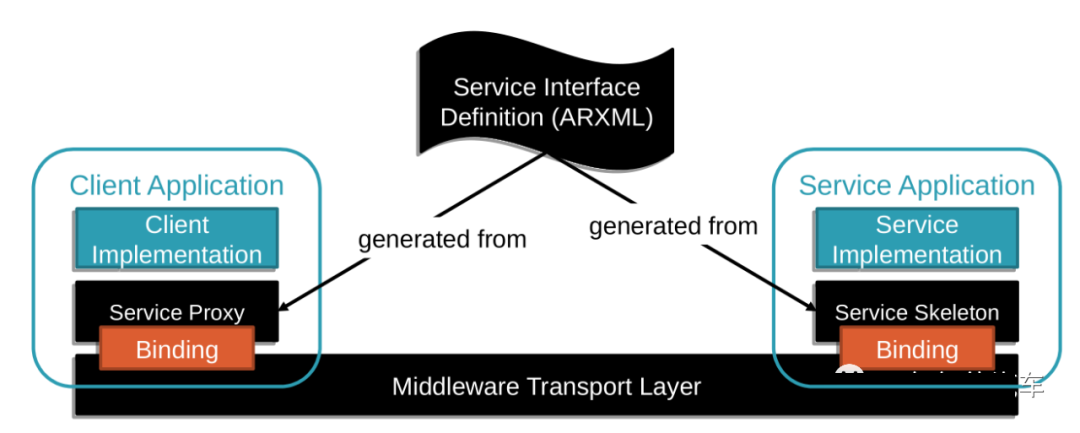 Application就是OS的一个一个进程,Autosar 采用一个Manifest用来配置管理这些进程信息,包含平台相关的信息,恢复操作以及与服务或库相关的依赖关系,Instance 配置文件主要包含静态的信息,这里会配合执行管理Exec、升级与配置管理UCM以及状态管理SM等来配合管理进程。自适应Autosar采用Proxy/Skeleton的通信架构,同时采用中间件SOME/IP