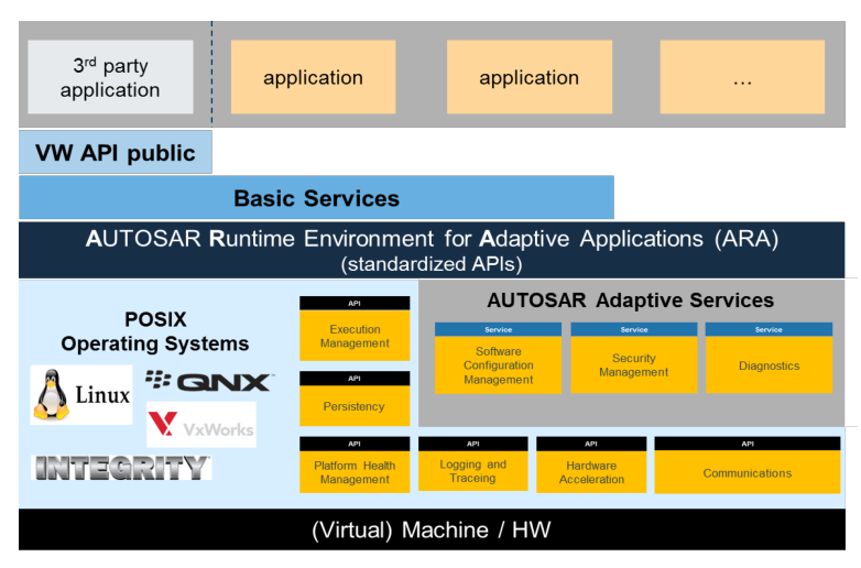 大众MEB的软件架构,POSIX可以是Linux、VxWorks、QNX、Integrity等。