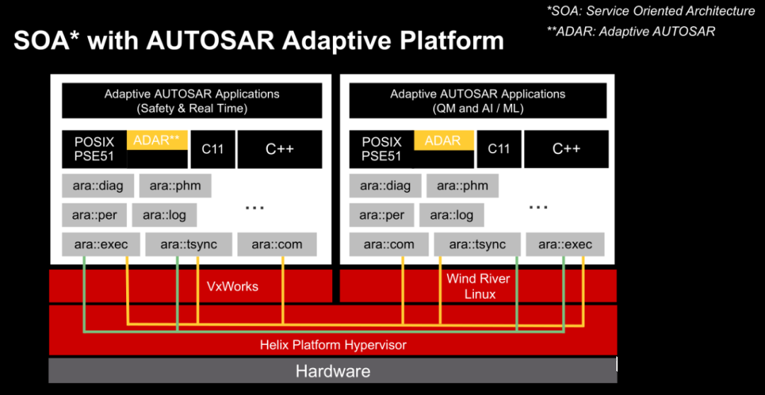 上图以WindRiver的操作系统为例,显示出Autosar的另一个优势,灵活架构。对于安全性和实时性要求高的领域采用VxWorks,对于要求不高也达不到高安全性的如深度学习(无功能安全要求)等采用Linux。在虚拟机上实现两个操作系统。顺便说一句Windriver是全球最大的商业RTOS供应商,最大的嵌入式商业Linux供应商。Windriver已经在2018年脱离英特尔独立。