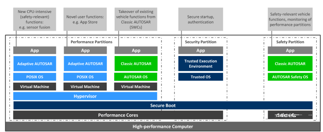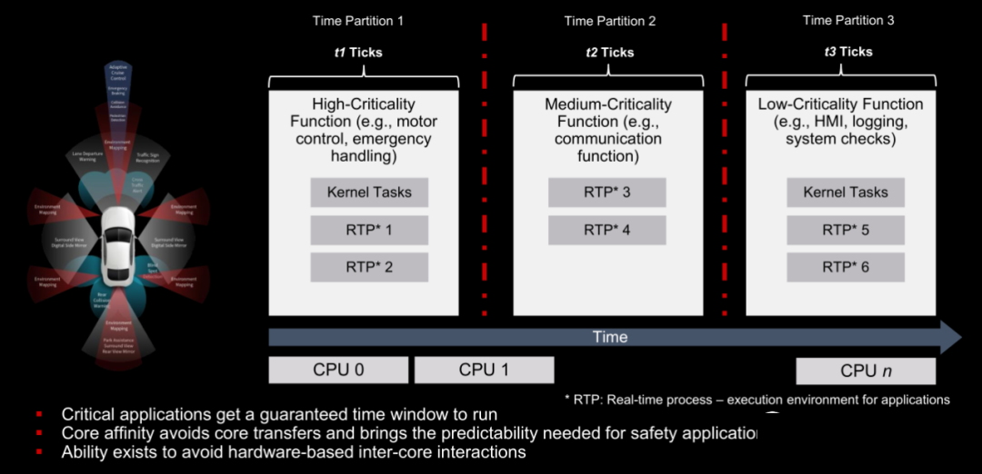多种操作系统等于自适应Autosar可以构建时间分区架构。避免各个CPU核心之间的干扰。保证ADAS的安全性。