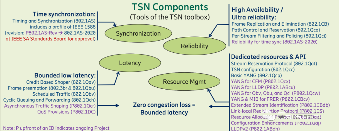 TSN标准包括时钟同步、超高可靠性、低延迟、资源管理四大类,紫色字体为尚未完成,截至2020年1月,2020年6月19日,802.1AS-2020版已经完成。