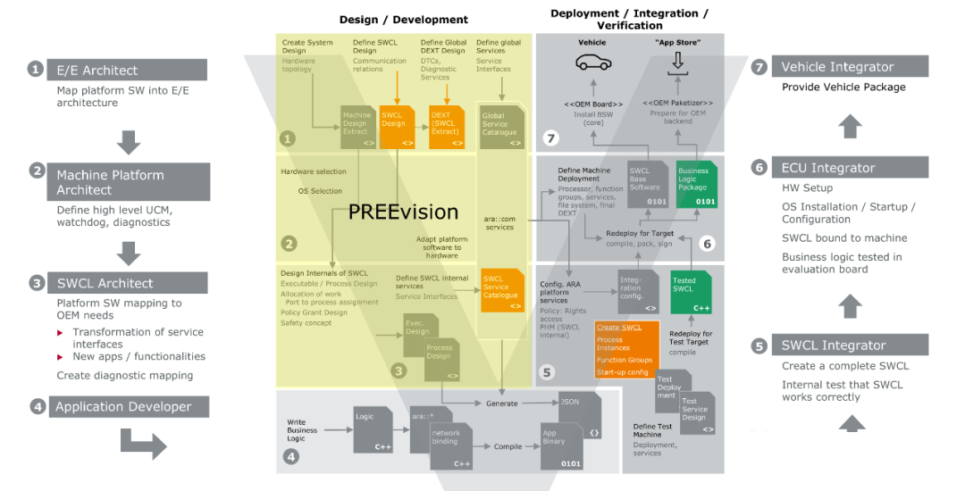 上图为Vector推荐的自适应Autosar开发流程图,与经典Autosar不同,自适应Autosar要求最好和整车电子架构一起开发,因为自适应Auotsar是整车电子架构的核心底层。因此自适应Autosar常常与整车电子设计架构软件PREEvision捆绑。