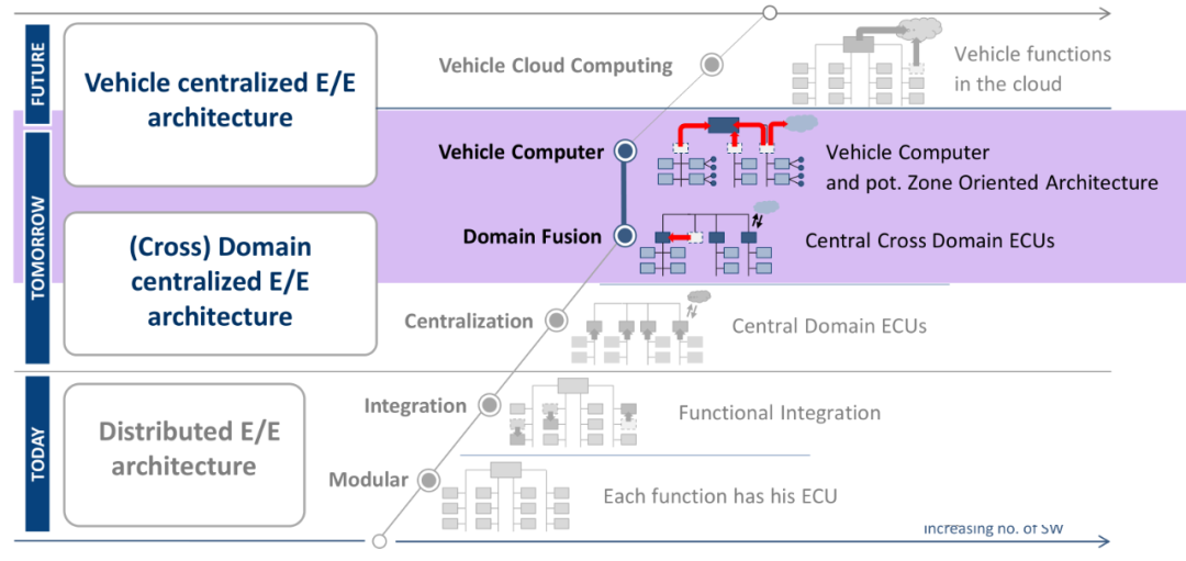 上图为汽车E/E架构演进路线图,资料来源:博世