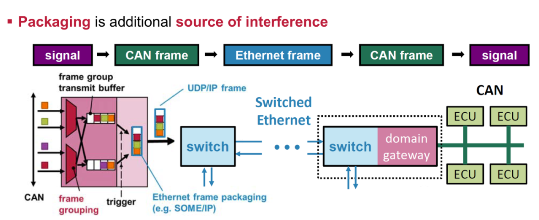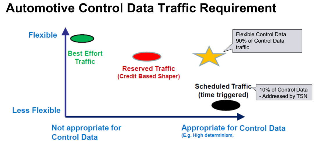 汽车控制数据可以分为三种,Scheduled Traffic、Reserved Traffic、Best-effort Traffic,Scheduled Traffic如底盘控制数据,没有任何的妥协余地,必须按照严格的时间要求送达,有些是只需要尽力而为的如娱乐系统数据,可以灵活掌握。汽车行业一般要求底盘系统延迟不超过5毫秒,最好是2.5毫秒或1毫秒,这也是车载以太网与通用以太网最大不同之处,要求低延迟。
