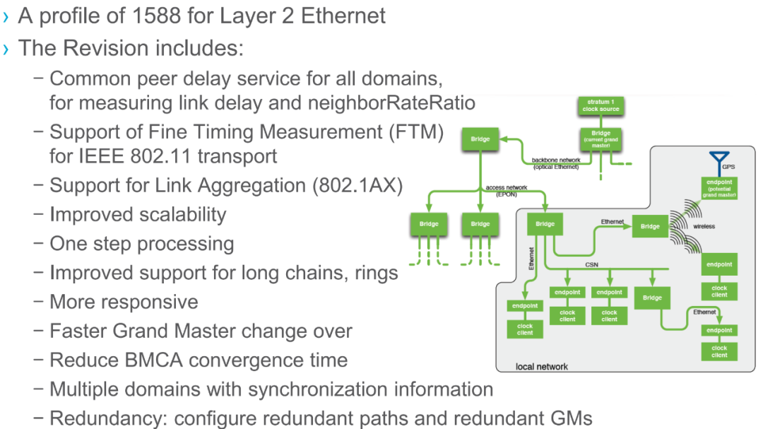 IEEE802.1AS-Rev是为以太网第二层所定义的1588规范加以扩展,它的扩展包括了所有域常用peer延迟服务,支持精细时间测量FTM,对链路聚合(802.1AX)的支持,改善的使用范围-包括1步时间戳标准化处理以及针对长链、环的支持,更好的响应能力,这包括了更快的主站交互、降低BMCA收敛时间。另外IEEE802.1AS-Rev支持了多域的同步信息传输以及冗余支持能力(可配置冗余路径和冗余主站)。对无线网络采用时间测量提供更好的支持。IEEE802.1AS-Rev的制定得到了AVNU联盟的大力支持,AVNU联盟由英特尔、思科和三星哈曼发起,是EAVB协议的主要提供者,AVNU联盟为IEEE802.1AS-Rev的实施提供协助,能够提供完整的协议栈和测试认证。