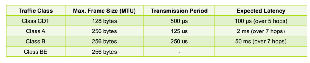 在TSN标准里,数据则被分为4级,最高的预计延迟时间仅为100微秒。